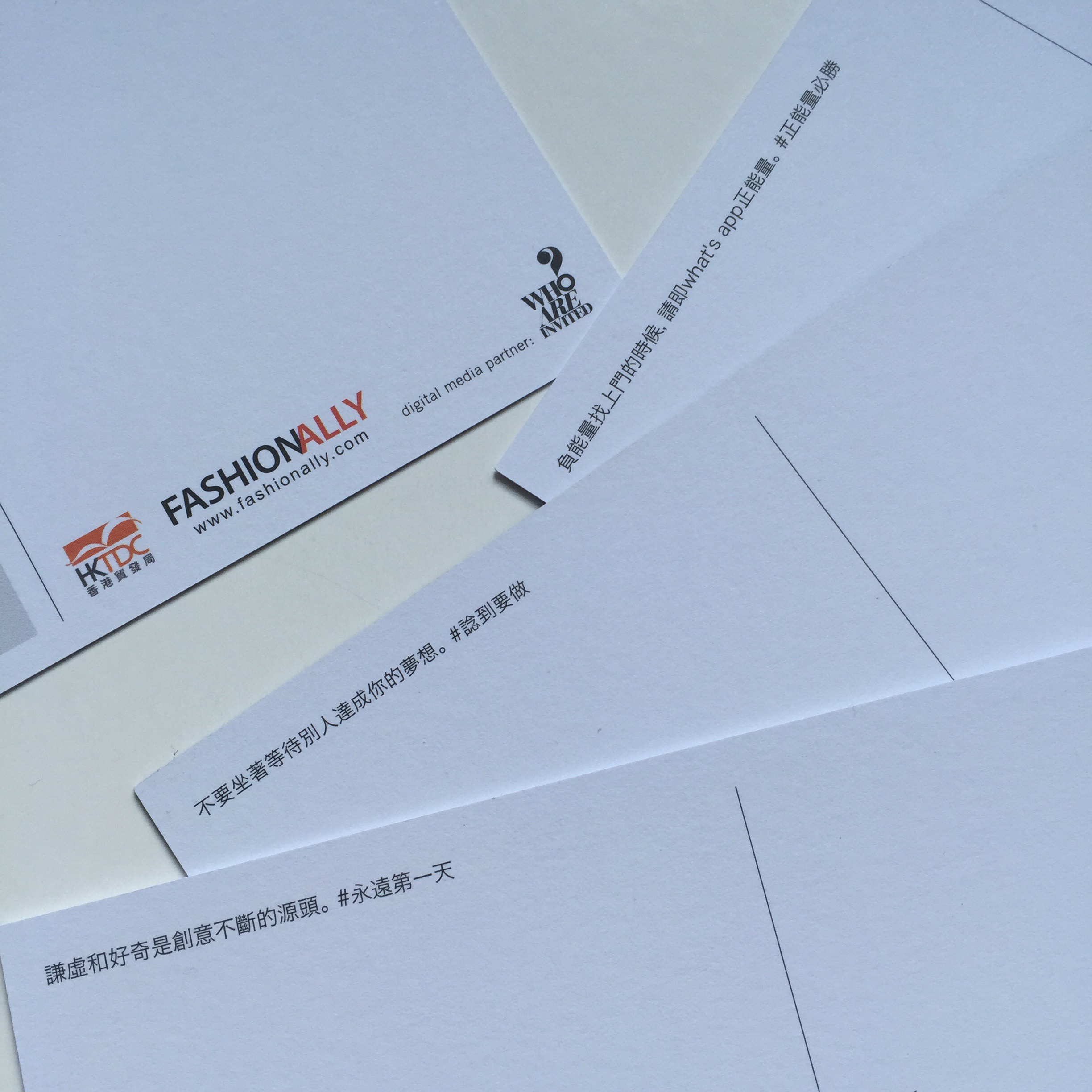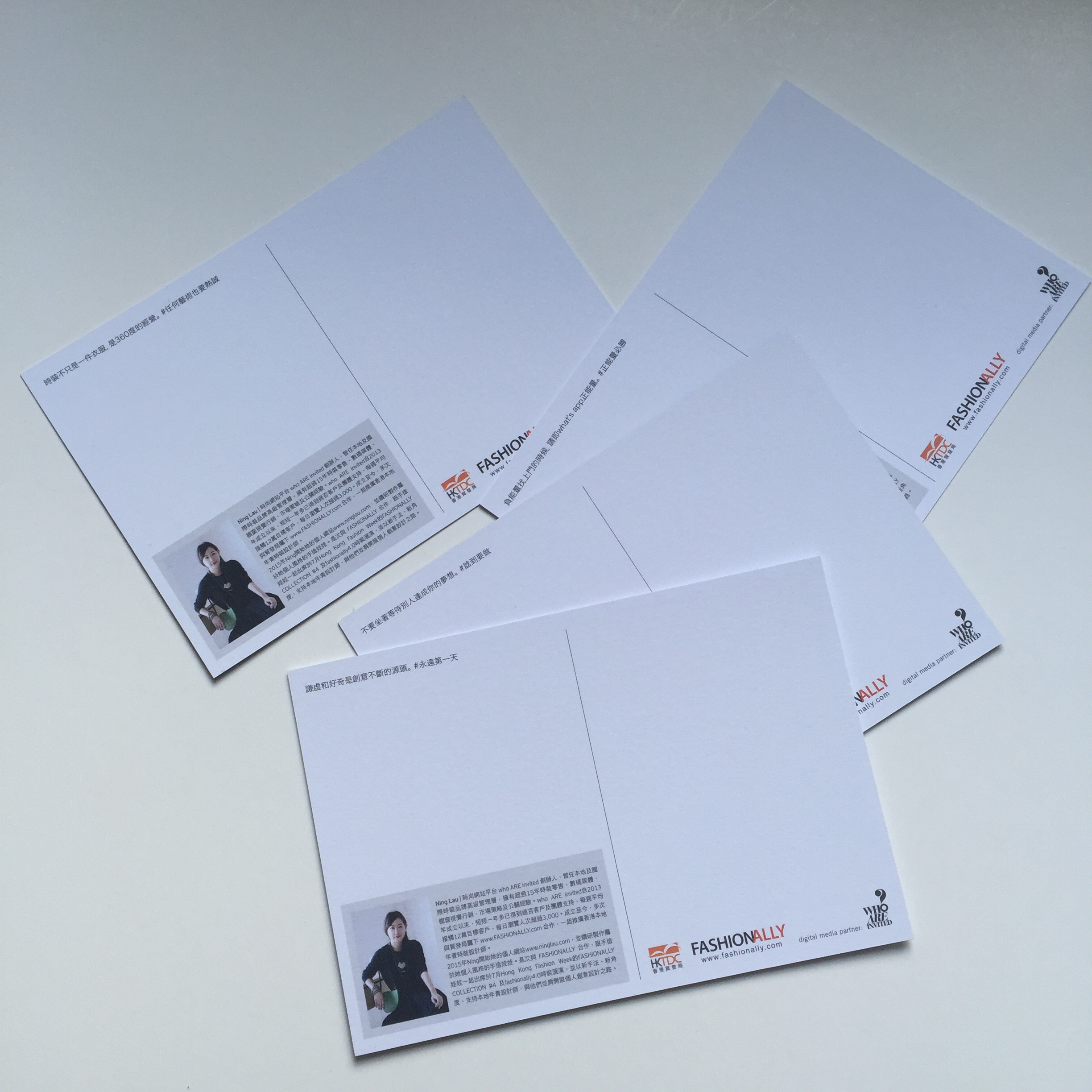幾位女生(Lisa, Victoria, Chang Yang, Pam & Katrina) 獲香港貿易發展局邀請參加2015年香港時裝周,將於7月6日出席在會展舉行的Hong Kong Fashion Week時裝匯演FASHIONALLY COLLECTION #4,她們都十分期待和興奮呢。為了這次的合作企劃隆重其事,大會特別設計了一系列她們肖像的特色紀念品送給VVIP嘉賓,並印有由時尚網站平台who ARE invited創辦人Ning Lau分享堅持創作的鼓勵語句,who ARE invited由2013成立至今,多次與貿發局屬下的www.FASHIONALLY.com 合作,一起推廣香港本地年青設計師。