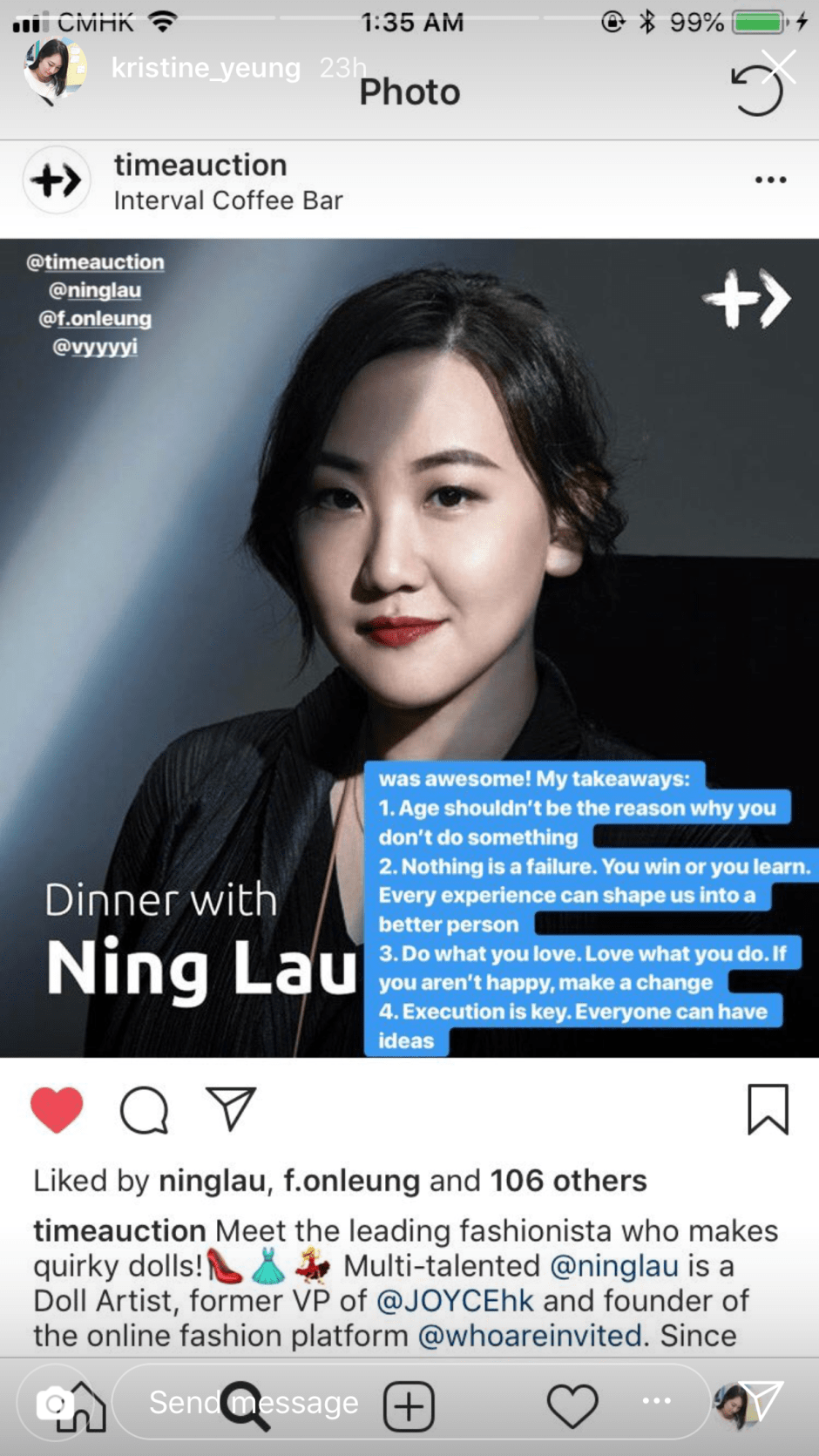 話說這個青年義工機構Time Auction 好橋,顧名思義用你的時間去投標,招募貢獻了任何義工服務時間起碼超過十小時的人和一位名人食餐飯,仲要bid一席位要鬥快(最多15個位),即係我付出一餐飯的時間就起碼集合貢獻咗150小時的義工服務,很有意義呀。該組織的顧問是青年事務委員會主席劉嗚煒,然後過往被約吃飯和大家分享的是陳方安生、盛智文、鬍鬚曾俊華、大集團CEO、貼地啲有Ben Sir⋯⋯我真的憑什麼😓究竟有誰會想和我食餐飯😂聽auntie講吓有正經事唔做走去整公仔?🤷🏻♀️