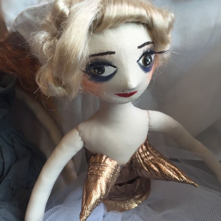 記得小時候稱得上「巨星」的都穿Romeo Gigli,當時只在最駕勢的時裝王國JOYCE發售。有幸在這公司工作的期間和這大師近距離相處:到過他在米蘭的家、和他在巴黎飲過咖啡、在威尼斯開店企劃時他帶我去大作家海明威到過的酒吧喝同一杯Bellini。製作這娃娃時把對這為藝術家Romeo的感覺及認識都放進創作裡去,過程中最難忘是找了很久也找不到同款布料,最後找到了,原來要造出這種效果,布裡要織入極幼鐵缐,顏色是我自己手染的,很喜歡她的髪型。like?